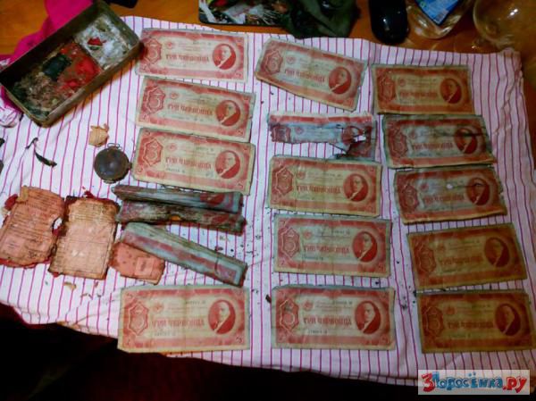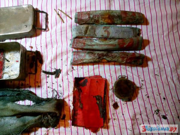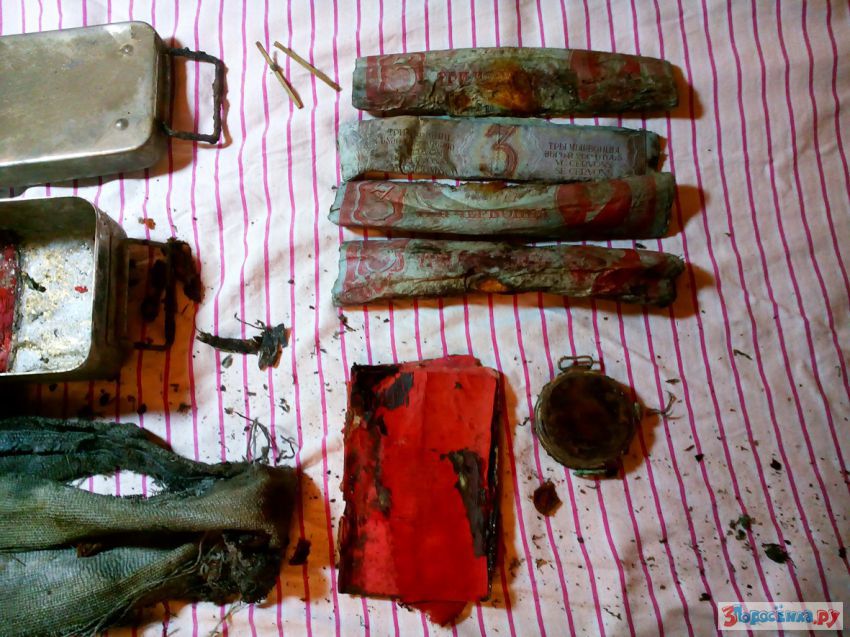 Были ли это его собственные деньги или казенные, ныне можно только гадать. В общей сложности, в биксе находились наручные часы "Кировские", 91 банкнота по три червонца, т.е. 273 червонца или 2730 рублей, партбилет, удостоверение офицера и почему-то две спички.