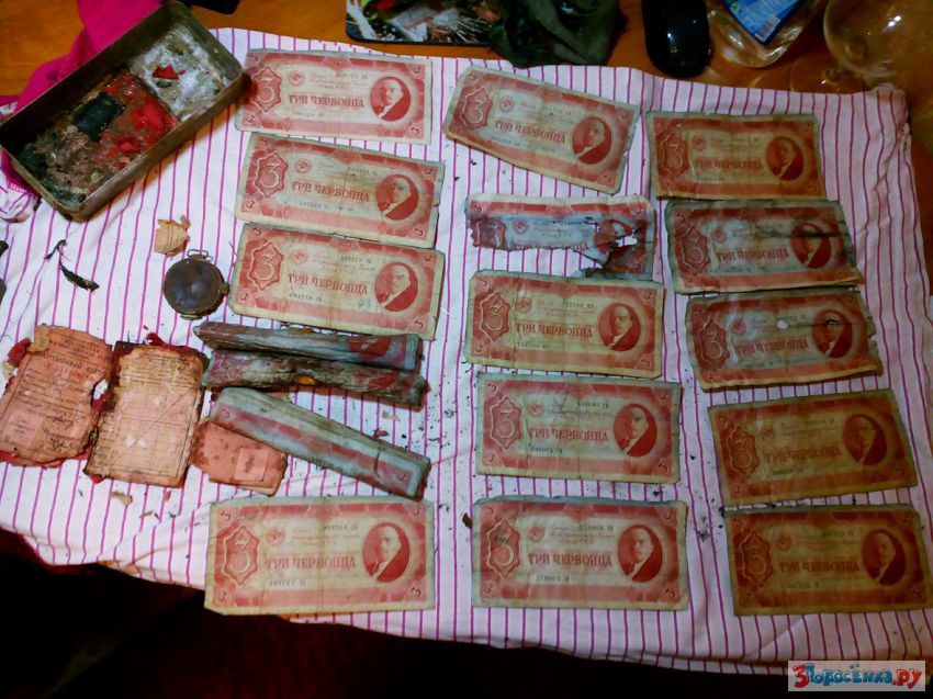 Все сомнения рассеялись, как только я открыл крышку: поверх старой, частично истлевшей ткани в виде длинных колбасок, лежали старые наручные часы. Немного разорвав ткань, нашим взглядам открылись червонцы.