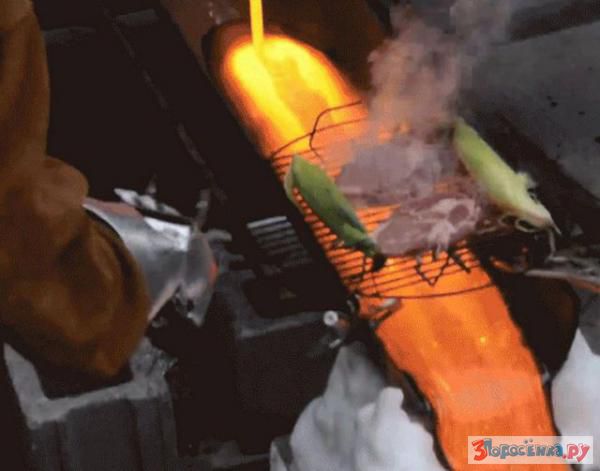 Эти мужики, работающие в плавильном цехе, знают, как жарить действительно мужской шашлык - им не нужны для этого угли, ведь у них есть металл, который в расплавленном виде поджаривает мясо и овощи особенным образом.