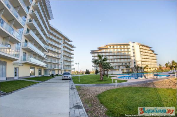 Огромная красивая территория с 10-ю гостиничными корпусами, ухоженными лужайками, искусственными прудами, бассейнами, пальмами и шезлонгами.