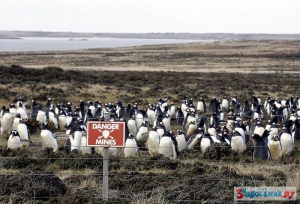 В 1982 году Аргентина, претендовавшая на территорию островов, принадлежавших Великобритании, высадила на побережье десант, который натыкал тут столько мин, что легче было не саперов приглашать, а обнести территорию оградой с предупреждающими табличками. Вес пингвинов куда меньше человеческого, так что они теперь здесь обосновались конкретно.