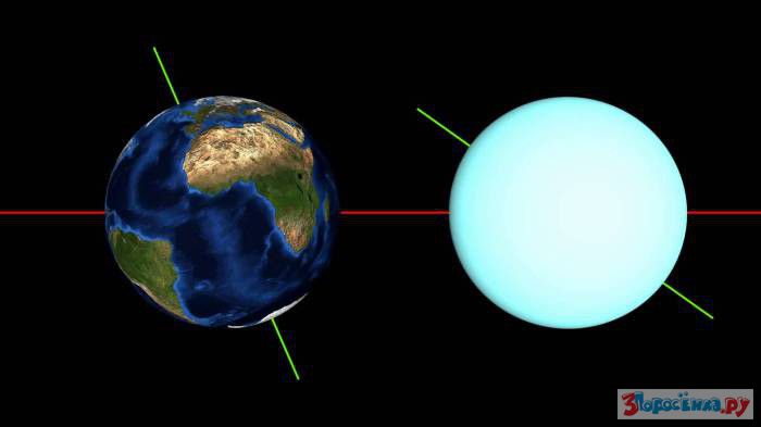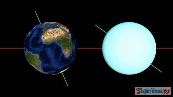 Все остальные планеты имеют почти вертикальную ось вращения по отношению к плоскости орбиты вокруг Солнца. Однако, Уран практически "лежит на боку" - его ось вращения наклонена по отношению к орбите на 98 градусов. Есть много теорий относительно того, почему так случилось, но ученые не имеют ни единого убедительного доказательства.
