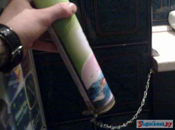 Владелец одного питейного заведения устал постоянно тратиться на освежители воздуха, потому как от желающих утащить банку домой (наверное, чтобы было что почитать на досуге) не было отбоя. Решение пришло само собой - цепочка и хомут.