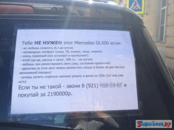 Правильная реклама - это прямой путь к успеху в любом деле. Понимая это, один житель северной столицы составил креативное объявление по продаже своего автомобиля Mercedes-Benz GL500.