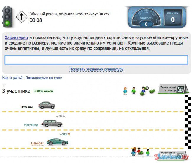 Тренажер скоростного ввода текста на клавиатуре, оформленный в игровом стиле. Чем быстрее вы набираете отображаемый на дисплее текст, тем быстрее едет ваш виртуальный автомобиль. Печатайте быстрее и побеждайте в гонке с незнакомыми людьми или со своими друзьями.