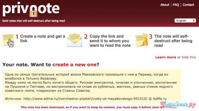 Этот ресурс позволяет создавать заметки, которые самоуничтожаются после прочтения адресатом. Вы можете использовать их в целях важной переписки или сообщений, которые должен получить только один человек и никто иной.