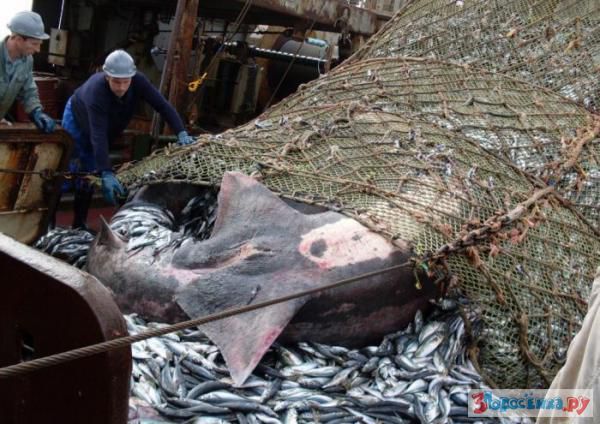 Мужики на обычном рыболовецком судне вытащили партию рыбы сетью, и среди мелочи нашли действительно большую рыбешку - огромную акулу. Размахом рук размер улова другим рыбакам не покажешь - придется таскать с собой фотку.
