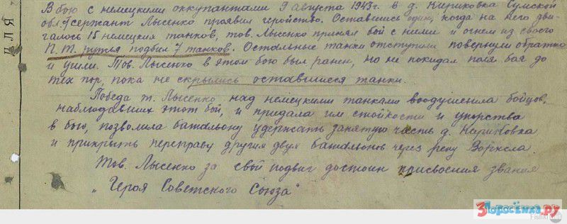 Единоборство Ивана Лысенко с немецкими танками позволило батальону удержать занятую часть села Кириковка и обеспечило успешную переправу подразделений полка через реку Ворскла.
