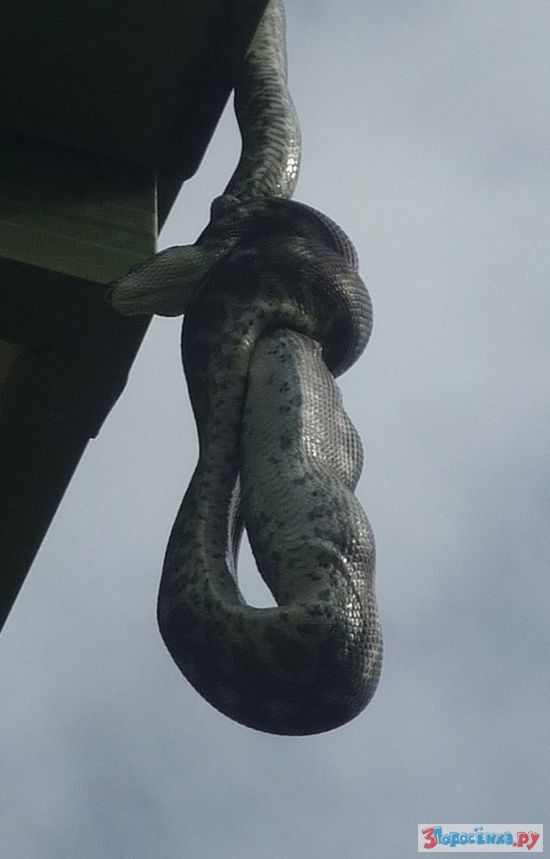 Проснувшись сегодня утром в суматохе, весело болтая, мы вышли из дома и вдруг... столкнулись с питоном прямо на пороге своего жилища. Он был занят поеданием бледноголовой розеллы на крыше. Увлекательное зрелище! Проглатывание жертвы занято у огромной змеи около часа.