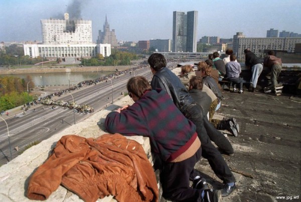 Зеваки с крыши дома наблюдают за штурмом белого дома