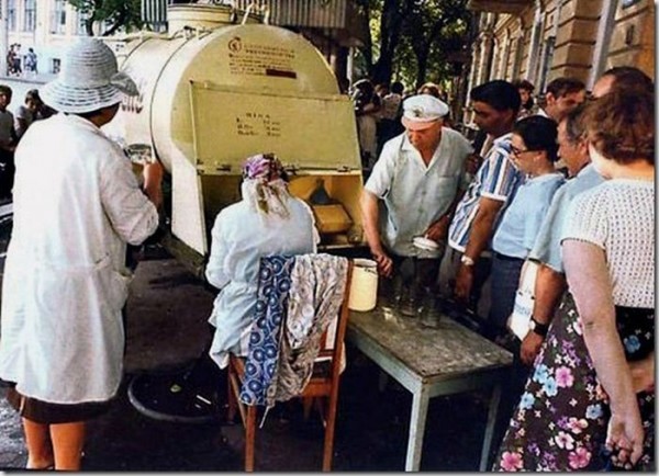 Летом был популярен квас из бочки, за ним ходили с бидончиками и с банками в авоськах, СССР, 1970-е