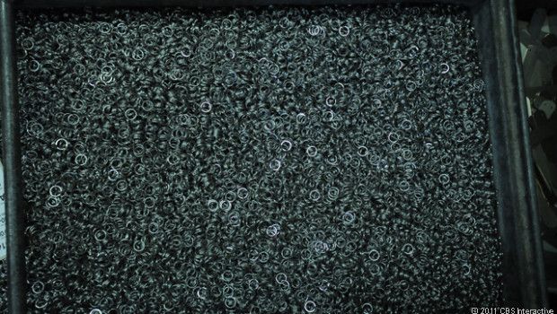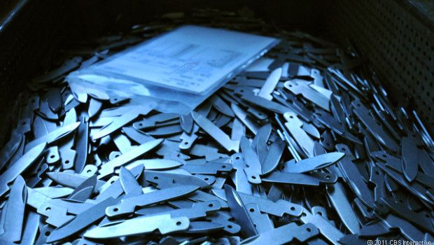 Заготовки лезвий укладываются на конвейер. Они отправятся в печь, где они подвергнутся воздействию температуры в 1050 градусов для того, чтобы закалить нержавеющую сталь. Это увеличит срок их эксплуатации на десятилетия.