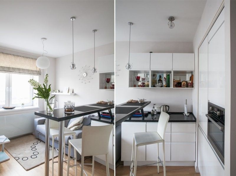 Длинные кухни - это стильно. Если у вас слишком большая кухня и маленькая гостиная, то зоны вместо стен можно разделить с помощью стеллажей