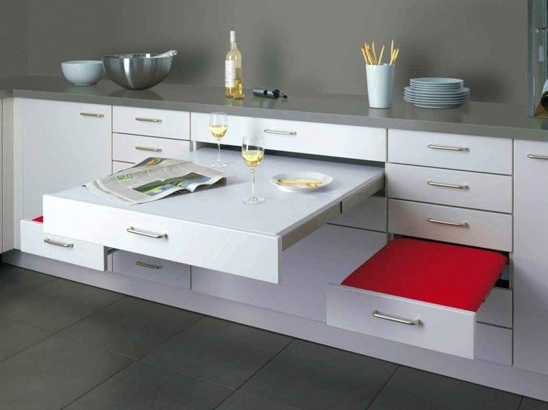 В кухне, безусловно, самое главное - техника и рабочее пространство, в первую очередь размещают это, но и есть, приготовленное на этой самой технике, тоже надо. Вот одно из возможных решений для обеденного стола
