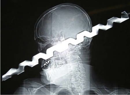 Рентгенография черепа Рона Ханта, строителя, упавшего с лестницы, показывает, что сквозь его голову прошло сверло почти 46 см длиной. Оно пронзило глазницу и вышло с обратной стороны черепа минуя мозг. Выжил...