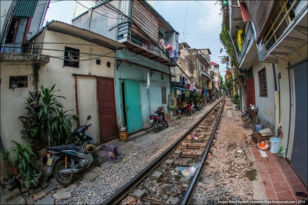Мы привыкли к тому, что жить в центре столицы престижно. Но вот интересно, считают ли престижными свои дома жильцы этого квартала в самом центре Ханоя - столицы Вьетнама? Дело в том, что через этот квартал проходит железная дорога, по которой ходят пассажирские поезда, а сам квартал настолько узкий, что расстояния между домами лишь на несколько десятков сантиметров больше ширины локомотива и вагонов.