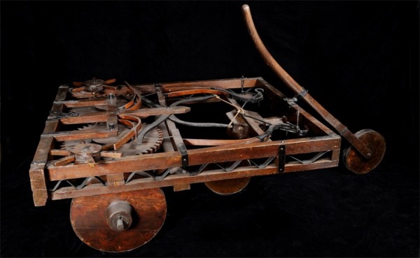 Самоходная тележка очень похожа, и по сути дела, является предком нашего автомобиля. Она была изобретена да Винчи таким образом, что могла передвигаться как с водителем, так и без - своего рода "машина-робот". К сожалению, учёным не удалось детально изучить конструкцию, благодаря которому передвигалась машина, но они сделали предположение, что это был пружинный механизм. Он прятался внутри самой телеги, его необходимо было заводить рукой, после чего пружина разматывалась и телега двигалась.