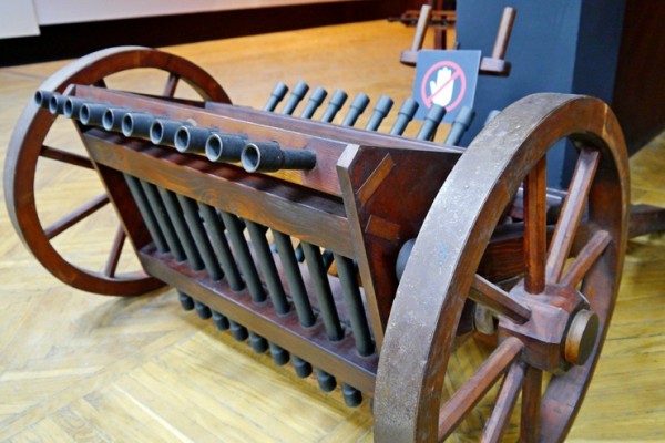 Леонардо да Винчи предложил собрать вместе 11 мушкетов на одной прямоугольной платформе, после этого сложить в треугольник три платформы и поместить вовнутрь вал. Подразумевалось, что пока один ряд мушкетов стрелял, два других бы остывали и перезаряжались. Как известно, не одно из изобретений да Винчи для убийств не было построено, но если бы этот пулемёт был сооружён, то он был крайне губителен для противника.