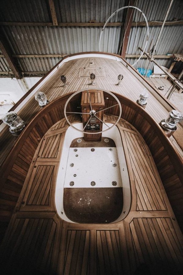 30-тонная яхта, покрытая стекловолокном для защиты дерева, имеет капитальные помещения и две большие каюты, в которых могут спать шесть человек.