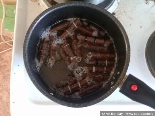 После этого я в сотейнике растопил свечку и после аккуратно погрузил заготовленные роллы в пропитку. Плавил свечу я в кастрюле на плите. Водяную баню я не использовал.