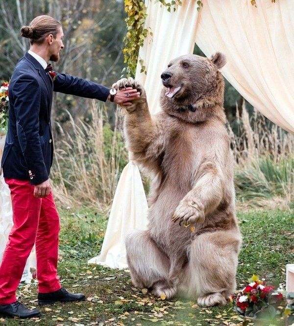 Москвичей поженил медведь Степан. Молодые говорят, было здорово: Степан интеллигентный и ласковый мишка, который охотно позировал в своей очаровательной бабочке.