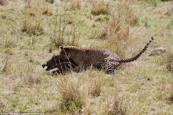 Беременная самка леопарда выслеживает бородавочника и в завершение охоты делает эффектный прыжок сверху на свою добычу. Редкие кадры сняты в Кении Питером Томпсоном.