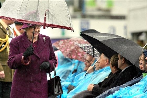 Будучи королевой Великобритании и живя в Лондоне, приходится волей-неволей думать о таком простом явлении, как дождь. И королева Елизавета делает это довольно часто. Поэтому нет ничего необычного в том, что во время официальных визитов королева храбро прячется под зонтиком с присущей ей грациозной улыбкой.