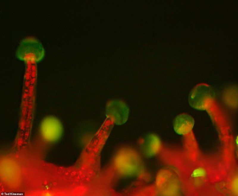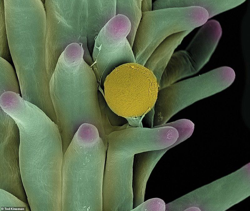 Пыльца в женской стигме (рыльце) в процессе передачи генетического материала от мужского растения женскому (опыления) для создания семени. Чтобы получить этот снимок, женские растения выращивались в непосредственной близости от мужских. Диаметр пыльцы - 20 мкм.