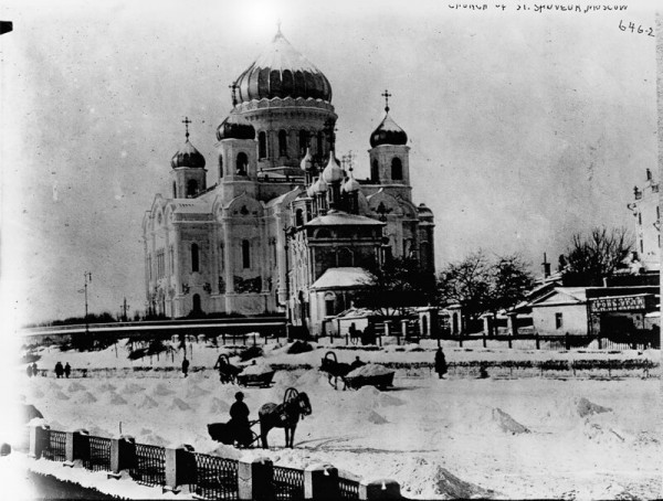 Начало XX века. Оригинальный храм Христа Спасителя. Здесь, скорее всего, автор снял сбор чистого снега. Куда и зачем его увозят, я не знаю. Возможно, кто-то из читателей в курсе происходящего? Расскажите в комментах!