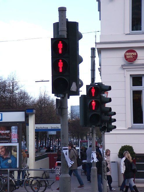 43. В Гамбурге большая часть светофоров имеет сразу 2 запрещающих красных сигнала на тот случай, если один выйдет из строя