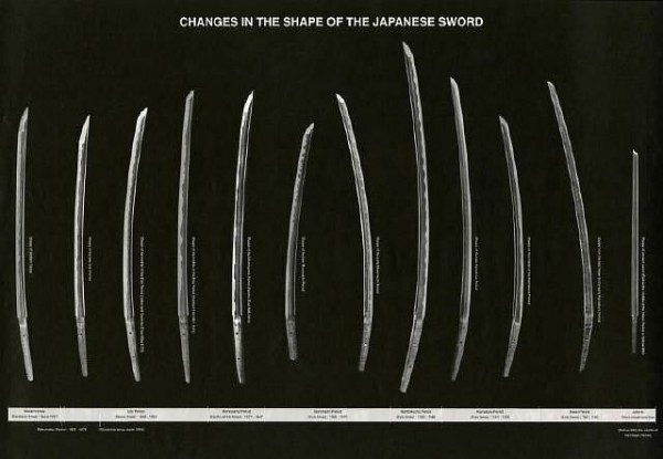 Ещё один миф связан с тем, что облик японских мечей оставался неизменным с течением времени. Действительно, японские мечи не подверглись трансформации так радикально, как европейские мечи, однако всё же можно проследить множество их тонких изменений на протяжении веков. На этой картинке устаревшие формы мечей представлены справа, а соверменные - слева.