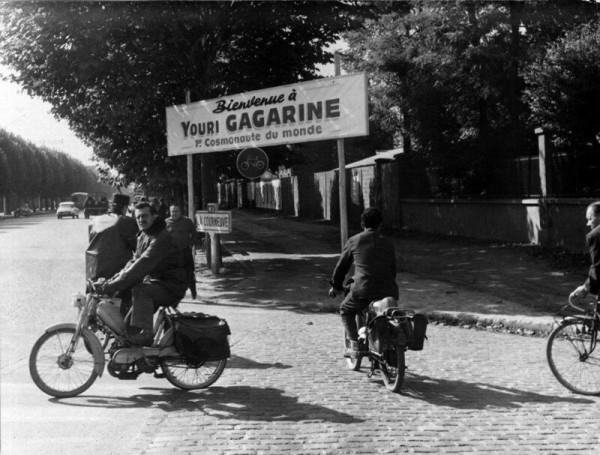 На плакате по-французски: "Добро пожаловать, Юрий Гагарин, первый космонавт мира"