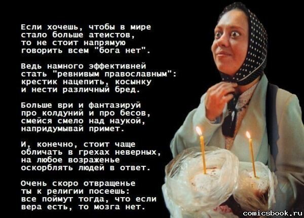 "Покрести, а потом вырастут - поменяют веру, если захотят" Пусть сначала вырастут. Зачем делать наброски с закрытыми глазами? Признаться, я до сих пор не определилась с местом, которое я искренне считала бы своим домом. Я не знаю, как зовут моего личного Бога по имени, но мне точно известно, что он есть. Я уважительно отношусь к любым храмам мира, знаю их историю и могу в них зайти, веря, что это особое энергетическое, символическое и смысловое пространство. Но свой персональный диалог с небесами веду в уютной тишине внутри собственной головы, если возникает такая потребность - лично мне не нужны посредники в виде священников в любых одеждах. Это никак не исключает того, что завтра меня вдруг озарит, что мой проводник к вере должен быть одет в сутану или тогу, носить бороду, выбритую лысину, дуршлаг на голове для макаронин или татуировки. Но пожалуйста, ради всего святого, пусть это будет мой личный осознанный выбор. И пусть у меня хватит мозгов и такта не навязывать своего мнения самым любимым людям на свете - моим детям. Я почитаю им на понятном им уровне Библию (которую неплохо знаю вместе с историей и символикой, начиная с ранних коптов и заканчивая разницей между современными течениями в христианстве). Объясню, зачем и почему все устроено именно так в буддистском монастыре, в который мы зайдём вместе. Поставлю запись шаманского варгана и бубна. Поищу и узнаю все про летающую макаронину и зелёных человечков.