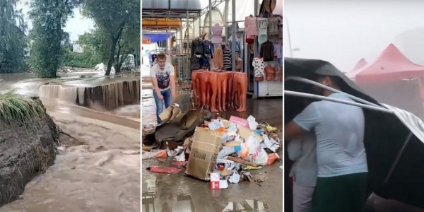 Продавцы небольшого рынка возле торгового центра Maximus пережили локальный апокалипсис. Ветер сломал палатки, разбросал фрукты и, вероятно, неслабо напугал людей.