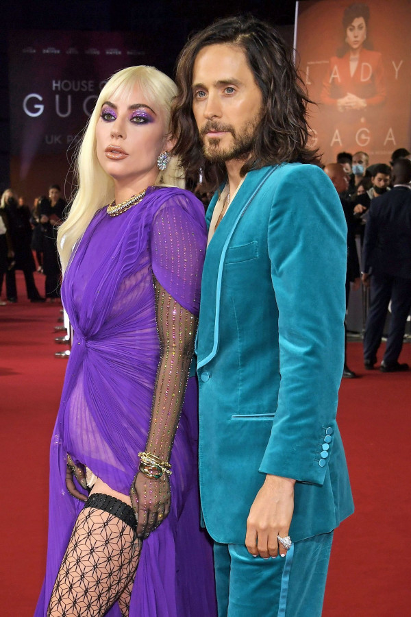 35-летняя американская певица, автор песен, продюсер, филантроп, дизайнер и актриса Леди Гага (Lady Gaga) в сексуальном платье позирует на красной дорожке для премьеры "Дома Гуччи" в Лондоне, Великобритания.