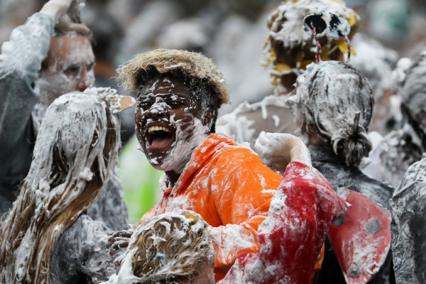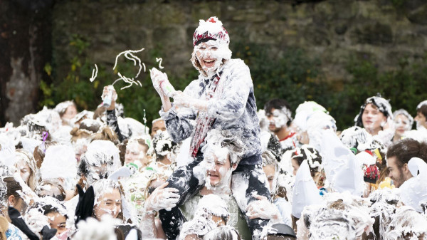 Кульминацией обряда посвящения являются новые первокурсники, известные как "дети", которые одеваются в яркие костюмы, прежде чем их обливают пеной во дворе Святого Сальватора в Файф-тауне.Изюмные выходные начались в воскресенье с того, что новичков в течение всего дня развлекали их академические "матери" и "отцы" - старшие студенты, которые выступают в качестве наставников для младших студентов и приветствуют их в университетской жизни.Мероприятие включает в себя охоту за мусором, вечеринки, веселье и игры в течение всего уик-энда перед финальным боем с пеной в понедельник.Университет говорит, что изюмный понедельник - это "празднование новых друзей на всю жизнь и участие в традиции, которая отличает Сент-Эндрюс", и описывает это как одну из "самых больших традиций в Сент-Эндрюсе".Торжества уходят корнями в далекую историю университета и названы в честь традиции, по которой "дети" давали своим академическим "родителям" фунт изюма - в настоящее время это, скорее всего, бутылка вина - в благодарность за то, что они приветствовали их в Сент-Эндрюсе.В Изюмный понедельник они получают квитанции за свои подарки от своих академических "отцов" и костюмы для ношения от своих "матерей". Затем "дети" спускаются на лужайку для борьбы с пеной.На странице университета в Facebook "Изюмные выходные" перед мероприятием студентам были даны рекомендации, в которых участникам советовали соблюдать безопасность и противокоронавирусные ограничения, которые включали уважение к тем, кто хочет поддерживать социальную дистанцию, носить маски в помещении и часто мыть руки.