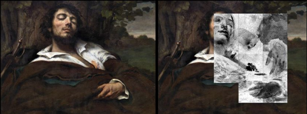 В 1973 году рентгенографический анализ картины французского художника Гюстава Курбе "Раненый", написанной между 1844 и 1854 годами, выявил, что под внешним слоем есть ещё. И даже не один, а два.На первом изображён незавершённый портрет молодой женщины. На втором портрете двое влюблённых, одним из которых был сам Гюстав в юности. Художник изображает себя молодым, спящим у подножия дерева, а прекрасная женщина кладёт голову ему на плечо. Считается, что на портрете изображена его возлюбленная Вирджиния Бине. Она была единственной женщиной, с которой Курбе поддерживал долгие отношения, и которая подарила ему сына.
