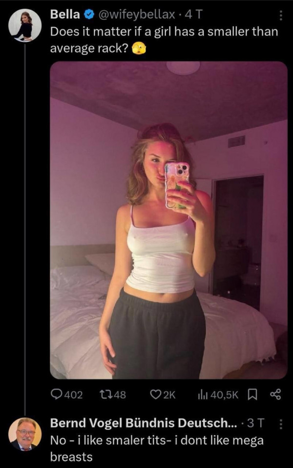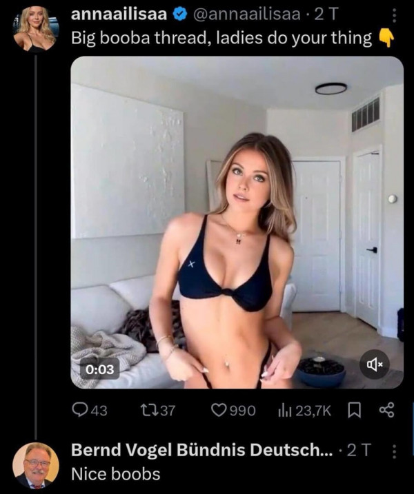 Немецкий политик Бернд Фогель оказался в эпицентре скандала: интернет-пользователи обратили внимание, что депутат в свободное время любит похаживать по профилям моделей в сети X* (Twitter). Эти девушки снимаются также для сайтов интимных фото и видео, где Фогель скорее всего также бывал. Неизвестно, какие комментарии он оставлял там, а вот в Твиттере, куда политик заходил со своего основного профиля, подписи под фото были вызывающими."Я хочу поцеловать твою вагину", - написал 75-летний депутат фотографией модели Люси Лемос.