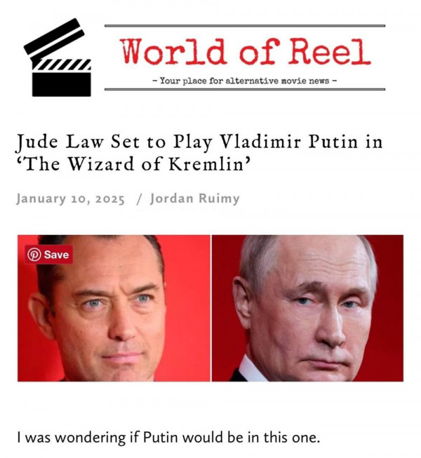Британская кинозвезда Джуд Лоу сыграет роль Владимира Путина в фильме французского режиссёра Оливье Ассайаса "Кремлёвский волшебник". Киноленту, жанр которой называют политическим триллером, снимут по одноимённой книге итальянско-швейцарского писателя Джулиано да Емполи.Действие фильма проходит в начале 90-х годах, в самом начале политической карьеры Путина. Главный герой картины - Вадим Баранов, молодой художник, который неожиданно становится телевизионным продюсером, а затем - пиарщиком перспективного сотрудника ФСБ Владимира Путина. Некоторые СМИ пишут, что прототипом политтехнолога Вадима Баранова стал Владислав Сурков - бывший помощник президента и экс-замглавы АП."Я говорю это нерешительно, потому что еще толком не начал работать над этим проектом. То есть как - я уже начал, но сейчас это похоже на восхождение на Эверест, поэтому я стою у подножия горы и смотрю вверх, думая: "О, Боже, что я сказал?" Я часто себя так чувствую, когда говорю "да". Я думаю: "О, Боже, как я это сделаю?" Но в любом случае, я с этим разберусь", - подтвердил работу над ролью Джуд Лоу.