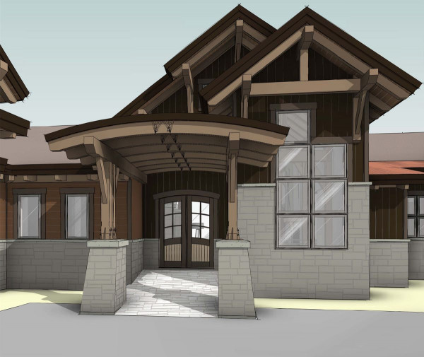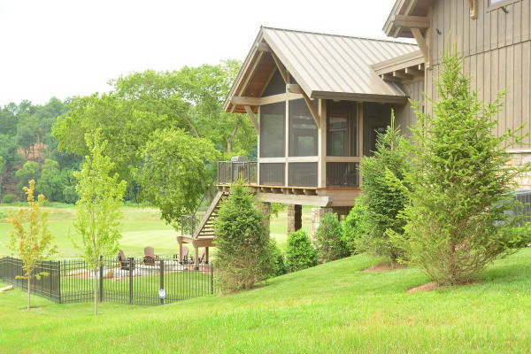 Со стороны дороги это практически полностью одноэтажный дом с роскошными деревянными фронтонами. На этом верхнем уровне размещены общая зона, главная спальня и гараж на три автомобиля, над которым находится гостевая комната. Внизу есть ещё две спальни, каждая с выходом в сад в сторону поля для гольфа, спортивная и семейная комнаты и комната для отдыха. Основные конструкции дома выполнены из дерева, конструктивная схема - деревянный каркас.