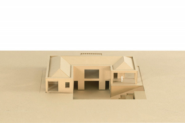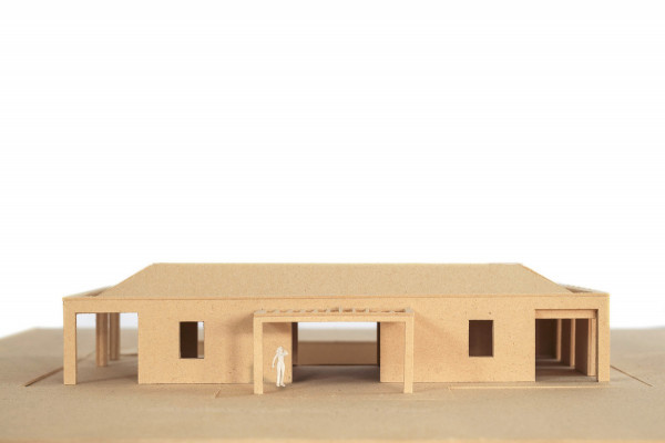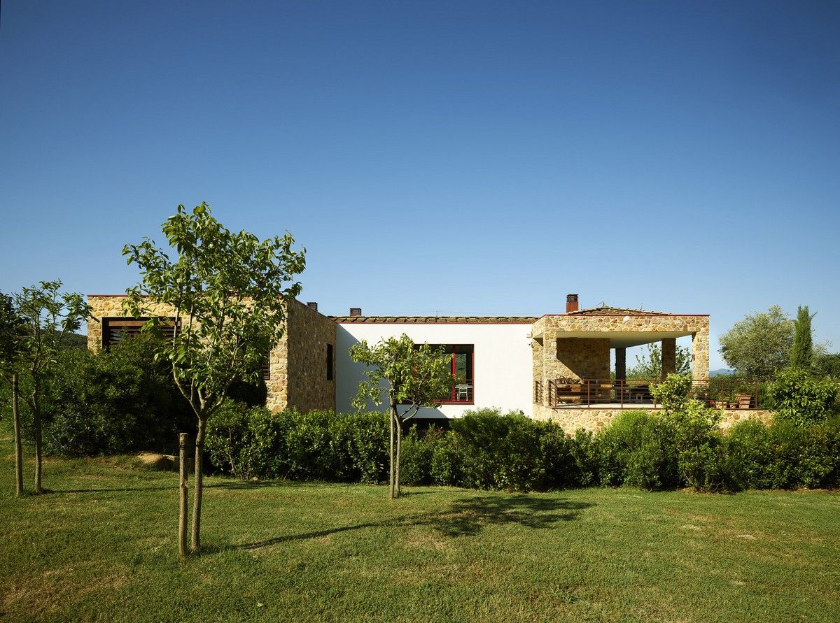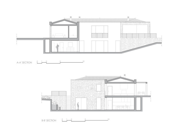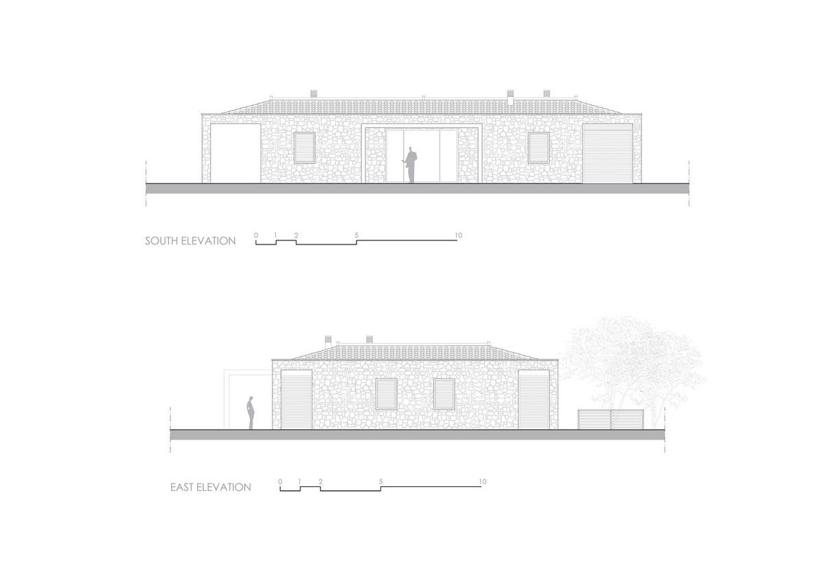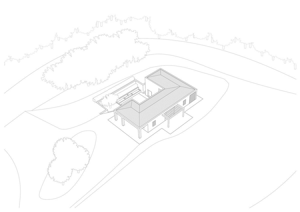 Главным фактором, наиболее серьезно влияющим на окружающую среду, является высота здания, поэтому для строительства был выбран полуподземный двор, позволяющий максимально заземлить нижний уровень и вывести на поверхность лишь один верхний этаж. Благодаря такой структуре, внутренний двор оказался "в яме", что имело как положительные моменты, так и отрицательные. Большим плюсом стало то, что дом получил уютный закрытый двор, своего рода частный "секретный сад". В то же время, такая особенность расположения здания требовала особого внимания к системе вентиляции и освещению помещений нижнего уровня.Внутренняя программа виллы имеет четкое разделение функциональных пространств, при этом, все они тесно связаны с внешней средой. Помещения, связанные с сельским хозяйством, размещены в подвальном этаже, а жилые и приватные помещения - на верхнем уровне, выходящим на юг склона в сторону ручья. Большой визуальной проницаемостью отличается социальная зона, имеющая открытую планировку.Большие окна, размещенные по обе стороны гостиной-столовой, создают панорамный архитектурный телескоп. Фасады, выходящие в сторону долины, прочно прилегают к земле, обеспечивая беспрепятственную связь между интерьером и экстерьером. Большие французские двери, при желании, могут быть полностью открытыми к бетонному подиуму, окружающему здание, создавая различные пространственные взаимоотношения.Во время раскопок внутреннего двора, был найден камень, пригодный для строительных работ. Учитывая его высокие экологические качества и преимущества доступа, было решено выполнить из него облицовку здания. В результате, местный камень желтого цвета стал украшением экстерьера, привнося в его оформление особенный колорит и выразительность. Его приятный естественный цвет и текстура стали определяющим фактором в дизайне надземной части здания.Горизонтальное развитие и архитектурная чистота объемов, покрытых камнем, их резкие и простые пластические соединения отсылают к средиземноморской архитектуре, которая в данном проекте переосмысливается в современном минималистичном ключе.