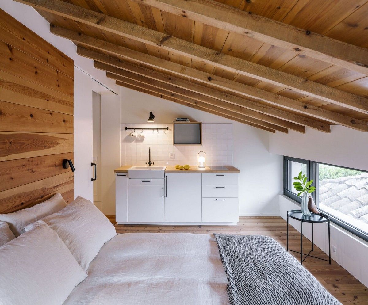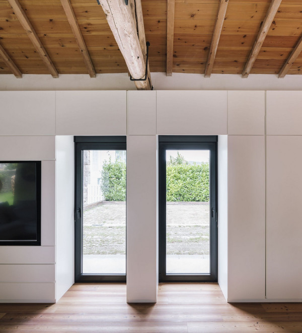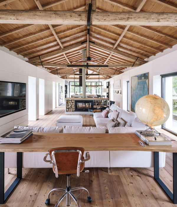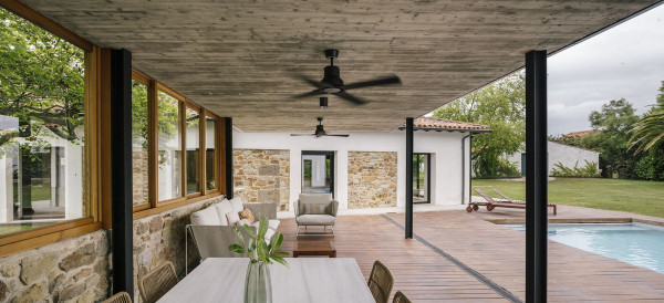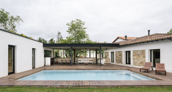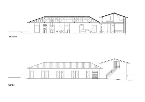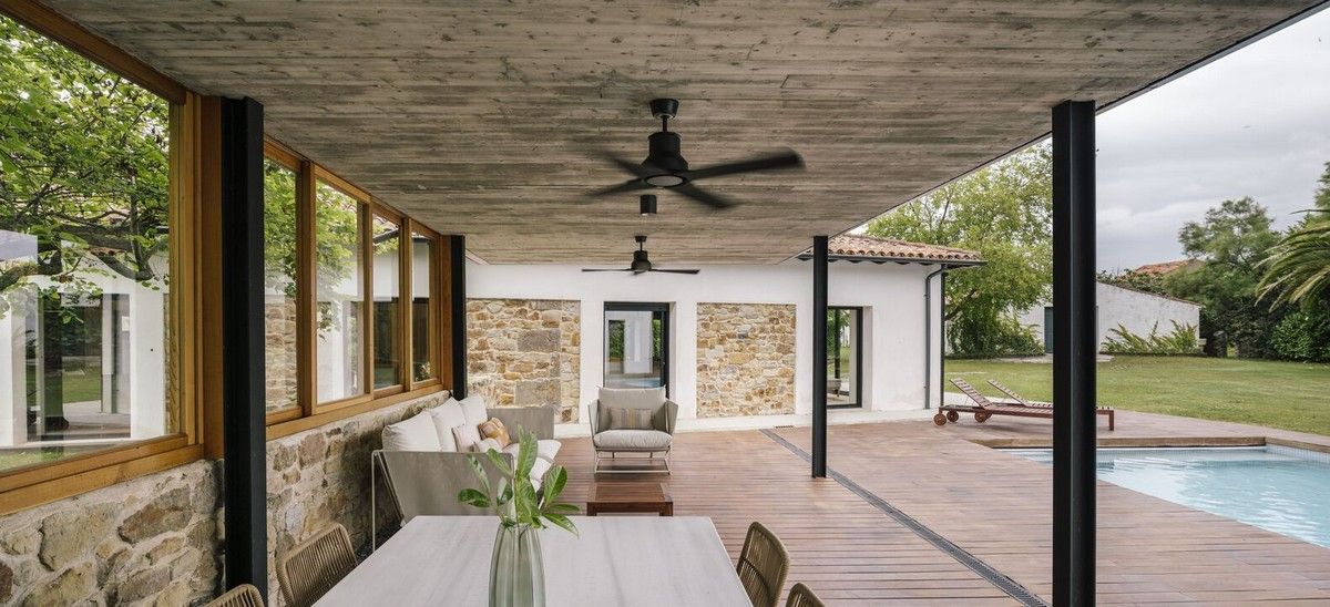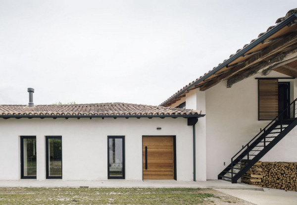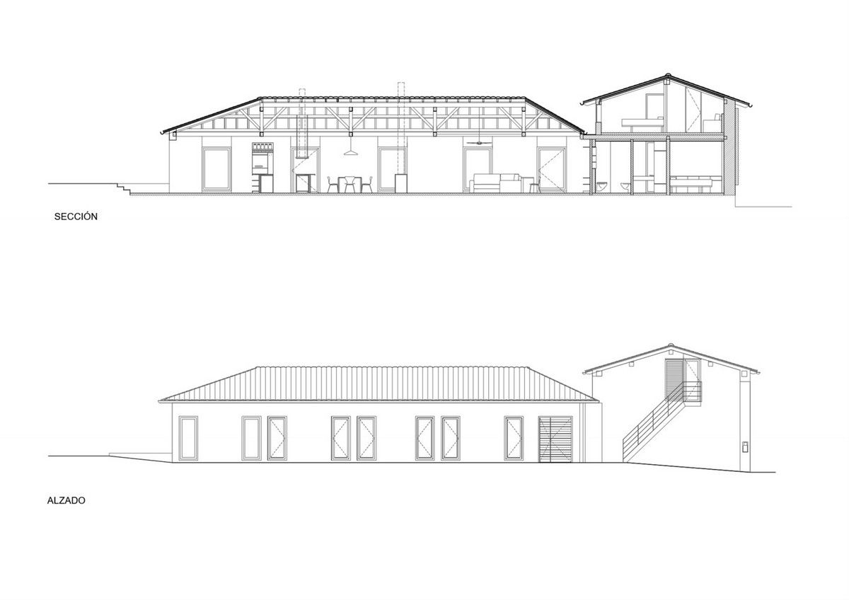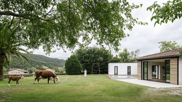 Вмешательство в оригинальное строение было основано на уважении и бережном отношении к его архитектуре. Первоначальное предназначение конюшни сохранено в простом деревенском облике здания, архитектура которого основана на несущих стенах и крыше из деревянных балок, покрытых черепицей. Самые значительные изменения коснулись восточного и южного фасадов, которые были почти полностью разрушены. Северный и западный фасады были отремонтированы и приобрели более современный вид. Новые большие окна открыли вид на горы и наполнили пространство естественным светом, а несколько стеклянных дверей обеспечили беспрепятственный выход из дома сразу во двор.Чтобы сохранить ощущение простора, от внутренних перегородок решили отказаться. Все пространство занимают линейно расположенные общественные зоны: кухня с дровяным камином, просторная столовая с деревянным обеденным столом, гостиная, центром которой является большой угловой диван нарядного белого цвета и домашний офис с библиотекой. Раздвижные стеклянные двери со стороны кухни связывают дом с открытой террасой. Деревянные жалюзи, при необходимости, обеспечивают конфиденциальность. Высокий потолок с открытой деревянной крышей и старыми деревянными балками создают особую деревенскую атмосферу, наполненную теплом и уютом. За деревянным стеллажом домашней библиотеки скрыта главная спальня с ванной и гардеробной. На верхнем этаже находится еще одна спальня.L-образная новая пристройка отличается более рациональной архитектурой, в то же время, сохраняющей простоту и строгость. Она отделена от существующего строения большой крытой верандой с прекрасно оборудованной зоной отдыха. Между двумя строениями оборудован открытый бассейн с деревянной палубой. Пристройка располагает гостевым номером и сауной.Общая площадь дома после реконструкции и расширения составила 310 квадратных метров. В дизайне экстерьера и интерьера используется много натуральных материалов, доминирующими среди которых являются местные дерево и камень. Металлическая конструкция и бетон создают современный контраст традиционной архитектуре. Открытая планировка, панорамное остекление и множество выходов из помещений во двор обеспечивают ощущение единства внешних и внутренних пространств.Сохранив типичную атмосферу кантабрийских домов, резиденция обладает всеми современными удобствами, что делает пребывание в нем комфортным и привлекательным.