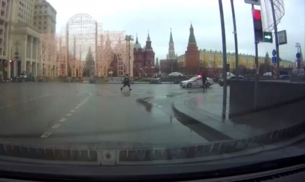 В Москве неизвестный мужчина попытался остановить кортеж с мигалками неподалеку от Кремля. Автомобильный регистратор запечатлел любителя острых ощущений.