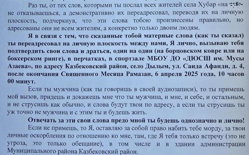 Разгорячённый оскорблением депутат уже начал готовиться:Я это дело так не оставлю. Как это: послал 2 тысячи человек, и никто не реагирует? Так же нельзя. Я утром и вечером бегаю, занимаюсь. Он был начальником милиции, человек физически и психологически должен быть подготовленным, но я не знаю, хватит ли у него мужества выйти на бой с обычным человеком.На дело уже обратил внимание глава Дагестана Сергей Меликов и пообещал прислать в район председателя правительства, чтобы тот всё выяснил на месте. Но пока подготовка к поединку идёт полным ходом.