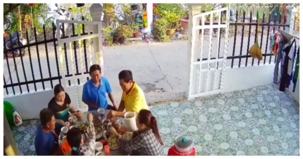 Камера наблюдения, установленная в одном из населенных пунктов Вьетнама, запечатлела ужин местных жителей, который чуть не закончился трагедией.