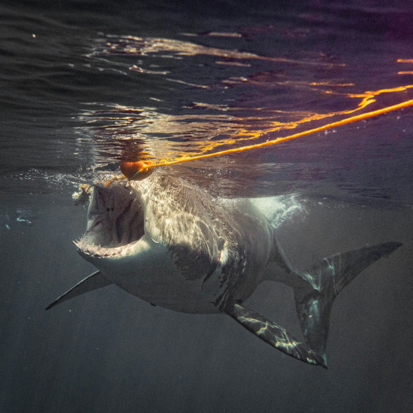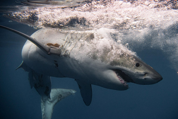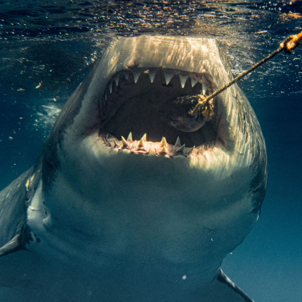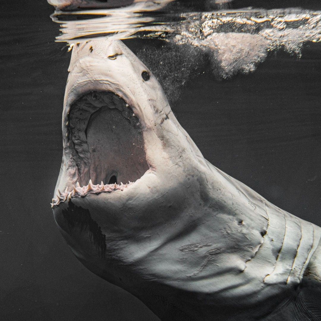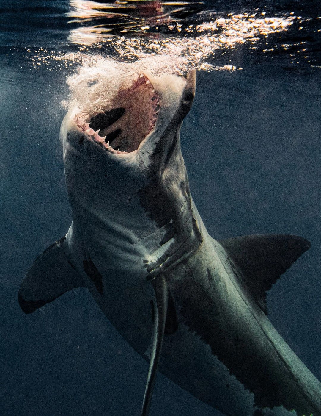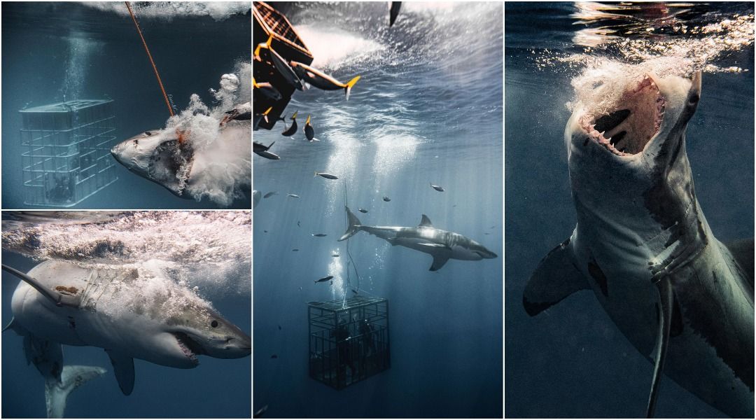 Потрясающие снимки, сделанные всего в нескольких дюймах от одного из самых опасных животных в мире, показывают момент, когда чудовищная большая белая акула сверкнула своими острыми как бритва зубами.