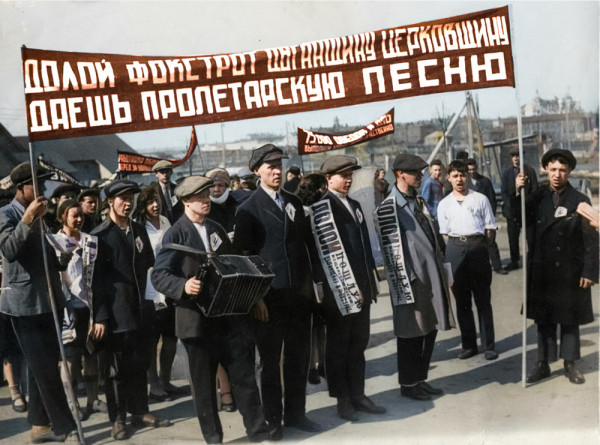 "Долой фокстрот, цыганщину, церковщину! Даешь пролетарскую песню! С Первомаем!" Демонстрация в Москве. 1 мая 1932 года.
