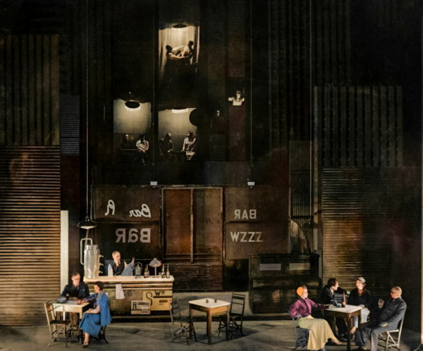 Декорации для спектакля "Запрещенное", пятого акта пьесы Софи Тредуэлл "Машинал", в Московском Камерном театре, Москва, 1933 год.Декорации, разработанные Вадимом Рындиным, показывают людей, пьющих в баре времен сухого закона.