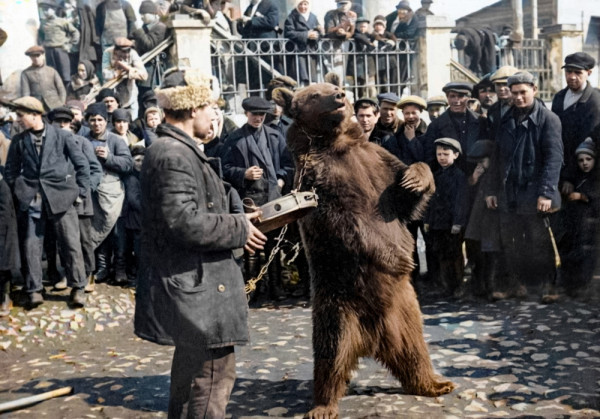 Дрессированный медведь развлекает толпу. Москва, 1930 год.Дрессированные медведи нередко становились участниками народных гуляний и цирковых представлений. Эти выступления, устраиваемые на площадях, в парках или перед зданиями, символизировали связь с традиционной культурой, переплетаясь с идеологией советского "нового быта". Медведи, обученные выполнять трюки - танцевать, крутить педали велосипеда или "салютовать" толпе, - привлекали зевак, становясь своеобразным символом эпохи, где элементы фольклора соседствовали с агитационными лозунгами.