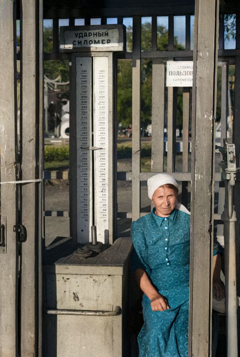 В парке культуры. Москва, 1939 год.Этот аттракцион назывался "силомер". За монету в 5 копеек участник получал в руки молот, которым требовалось нанести удар по специальному устройству - "наковальне". От силы удара срабатывал механизм: металлическая каретка (ползун) поднималась вверх по вертикальной шкале, фиксируя мощность натиска. Чем выше поднималась отметка, тем сильнее считался удар. Победитель, показавший лучший результат, награждался дополнительной попыткой - бесплатным ударом, чтобы побить собственный рекорд или соперничать с другими участниками.